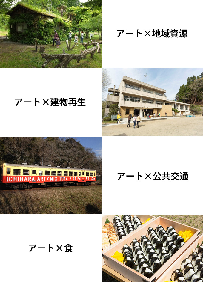 そして、アート×ミックスは、市原市の歴史・文化・自然・人の暮らし・食・スポーツなど、地域の持つ様々な資源を現代アートと融合し、里山に活力を漲らせ、より魅力的な「いちはら」を再発見する新しい形の芸術祭です。